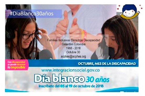 Por invitación de la alianza entre la Secretaría de Integración Social, programa Bogotá Incluyente y ACPHES fundador y constante realizador del Día Blanco año a año por la Visibilidad y reconocimiento de los derechos de las familias que viven la realidad de la discapacidad, al menos quince familias serán galardonadas luego de relatar sus logros en el proceso de inclusión social de personas con esta condición de vida.